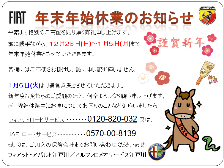 こんにちは! 佐々木です。いつもフィアット/アバルト江戸川ブログをご覧いただき、ありがとうございますm(__)m本日のブログは、年末年始休業のお知らせです!